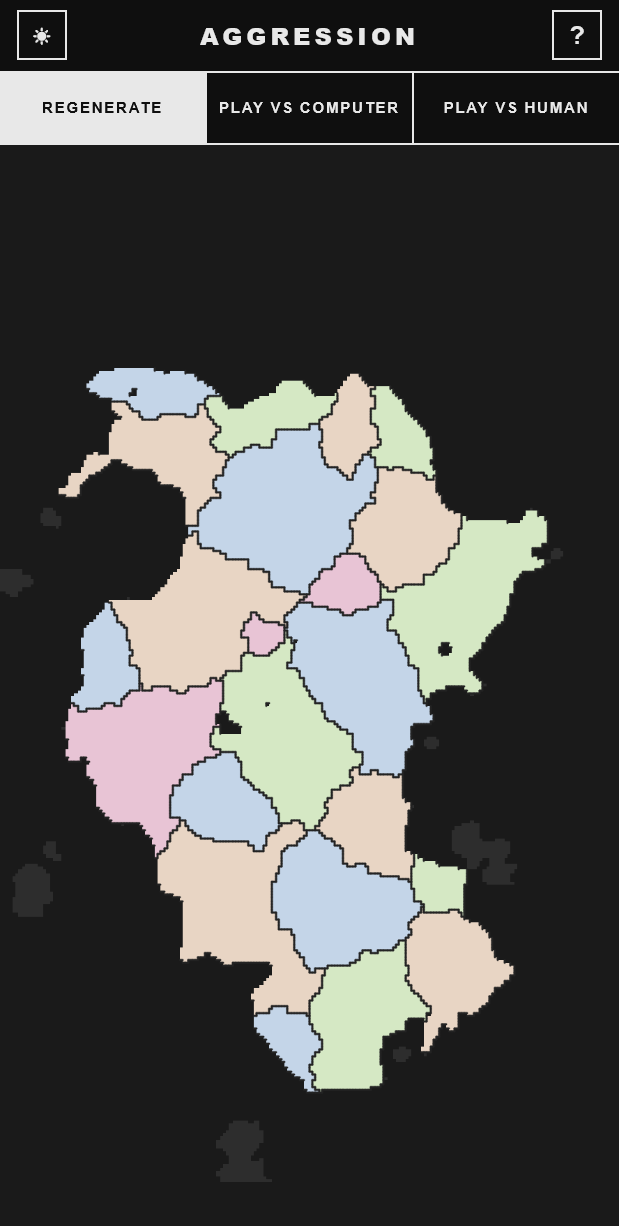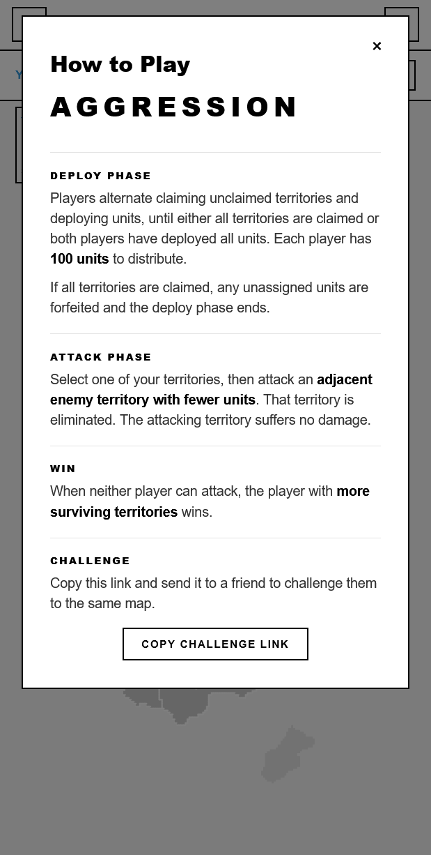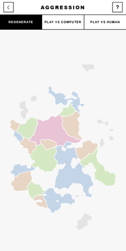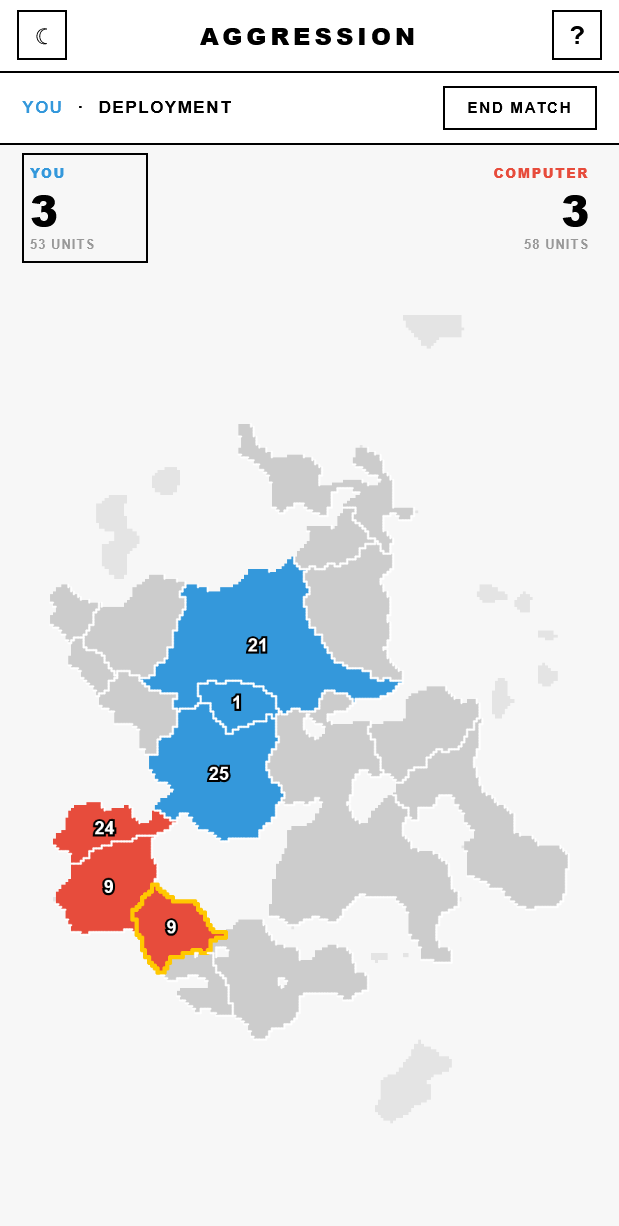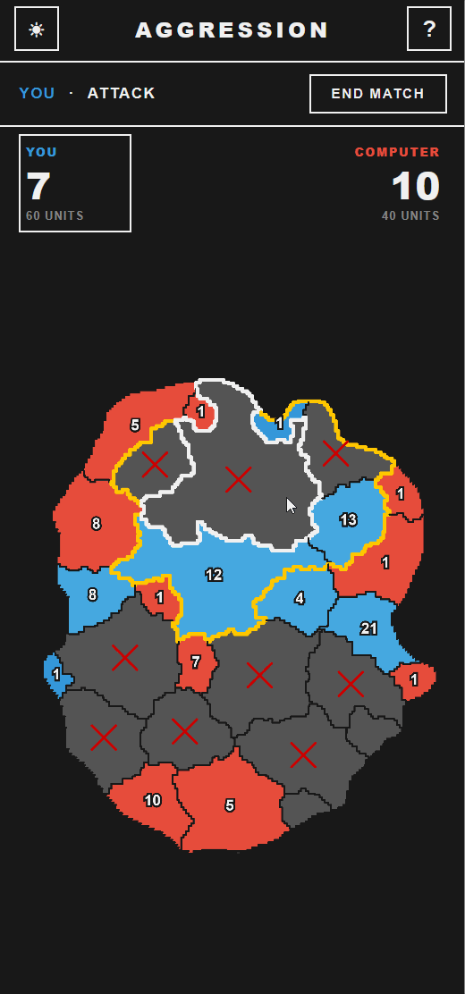 Aggression is an lightweight tactical game for two players. Players take turns committing 100 units each to unclaimed territories and then eliminating as many enemy territories as possible to end up with the higher number of territories at the end of the game. There's no randomness - in the attack phase, as long as a territory has more units, they win the attack and they lose no units. Blue player deploys first and attacks first.